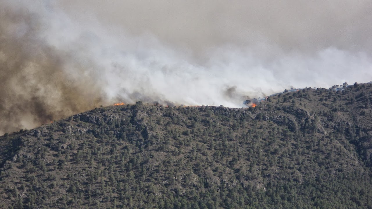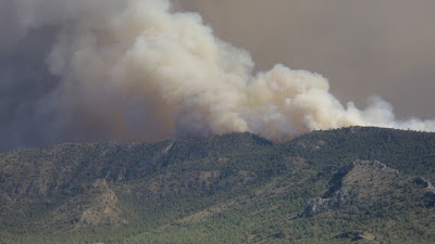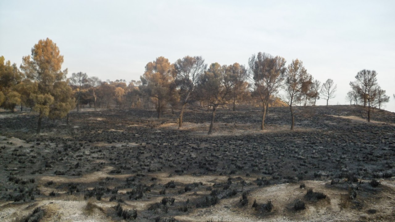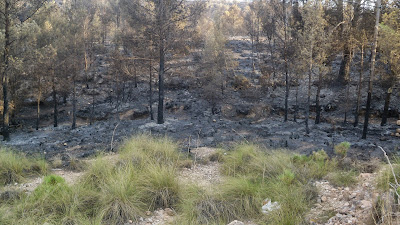 Toda la cara sur de la sierra de los Donceles es pura ceniza, ni un pino ni un matorral, aunque el la cara noroeste se han salvado bastantes pinos en la umbría de los Donceles y en más sitios. Pero en la zona centro y Oeste todo ha quedado arrasado por las llamas.